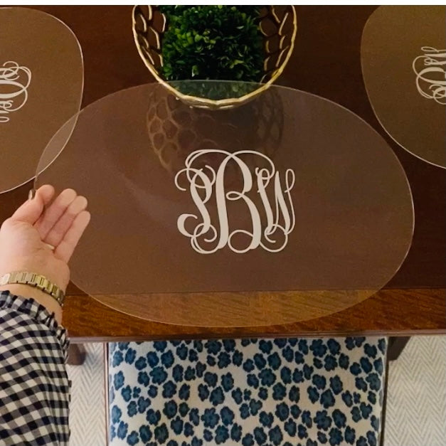 These stylish and durable acrylic placemats let your table or table cloth shine through! Choose a laser engraved monogram style and add a frame such as laurel leaves, greek key or antlers. So may personalization possibilities!